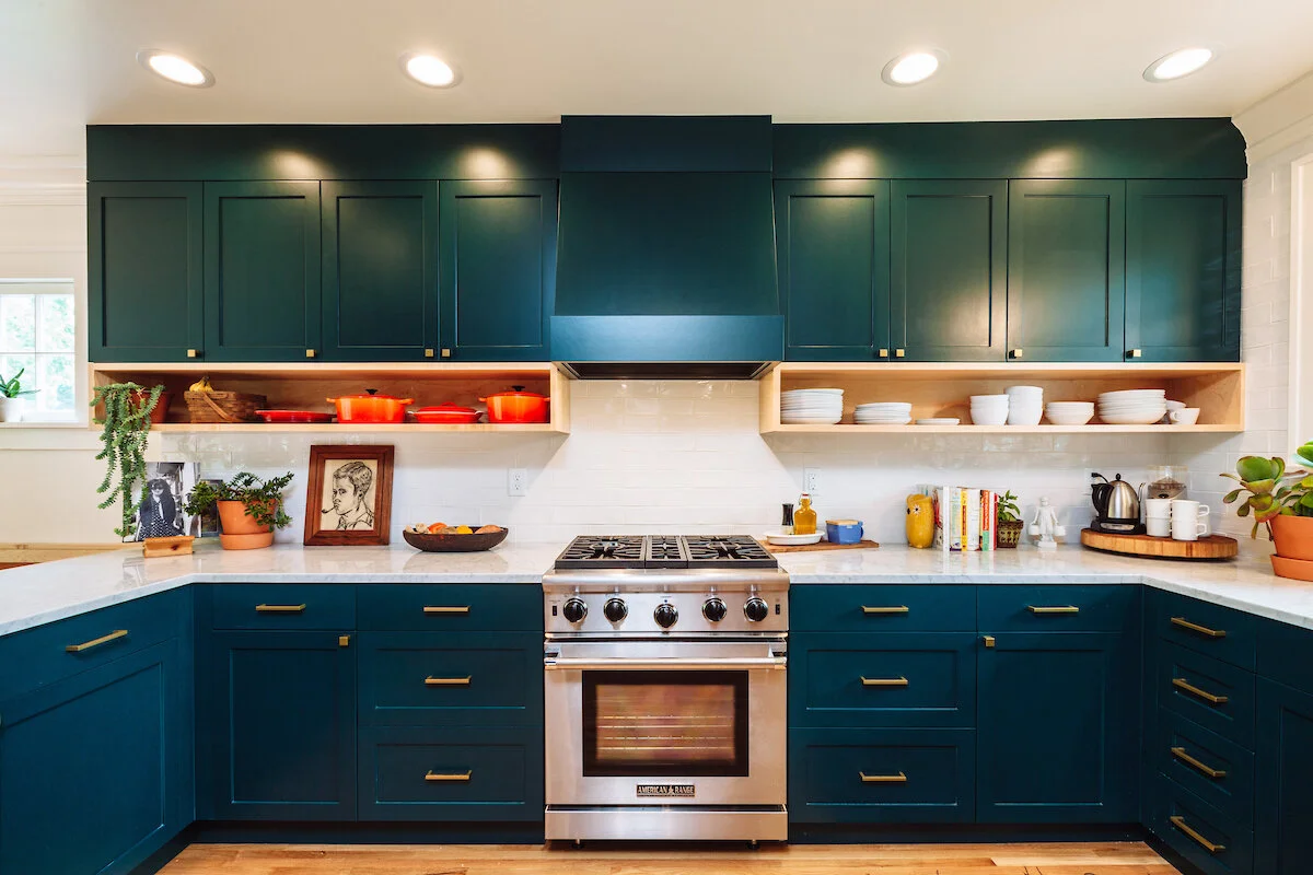 Here are 6 creative ways to include teal in your kitchen. See more ideas about kitchen cabinets kitchen remodel kitchen renovation. Dark teal cabinets look great with the white walls stainless steel appliances wood floating shelves and light wood floors.